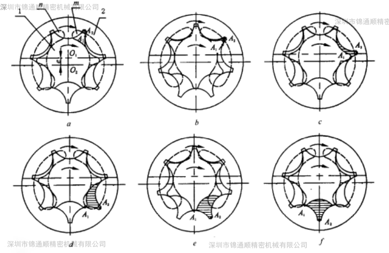 內(nèi)、外轉(zhuǎn)子相差一齒,圖1中內(nèi)轉(zhuǎn)子為六齒,外轉(zhuǎn)子為七齒,由于內(nèi)外轉(zhuǎn)子是多齒嚙合,這就形成了若干密封容積。當外轉(zhuǎn)子圍繞中心O2旋轉(zhuǎn)時,帶動內(nèi)轉(zhuǎn)子繞內(nèi)轉(zhuǎn)子中心O1作同向旋轉(zhuǎn)。這時,由內(nèi)轉(zhuǎn)子齒頂A1和外轉(zhuǎn)子齒谷 A2間形成的密封容積C(圖1中虛線部分),隨著轉(zhuǎn)子的轉(zhuǎn)動密封容積就逐漸擴大,于是就形成局部真空,油液從配油窗口b被吸入密封腔,至A1′、A2′位置時封閉容積最大,這時吸油完畢。當轉(zhuǎn)子繼續(xù)旋轉(zhuǎn)時,充滿油液的密封容積便逐漸減小,油液受擠壓,于是通過另一配油窗口a將油排出,至內(nèi)轉(zhuǎn)子的另一齒全部和外轉(zhuǎn)子的齒凹A2全部嚙合時,壓油完畢,內(nèi)轉(zhuǎn)子每轉(zhuǎn)一周,由內(nèi)轉(zhuǎn)子齒頂和外轉(zhuǎn)子齒谷所構(gòu)成的每個密封容積,完成吸、壓油各一次,當內(nèi)轉(zhuǎn)子連續(xù)轉(zhuǎn)動時,即完成了液壓泵的吸排油工作。