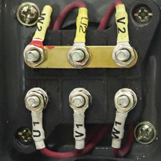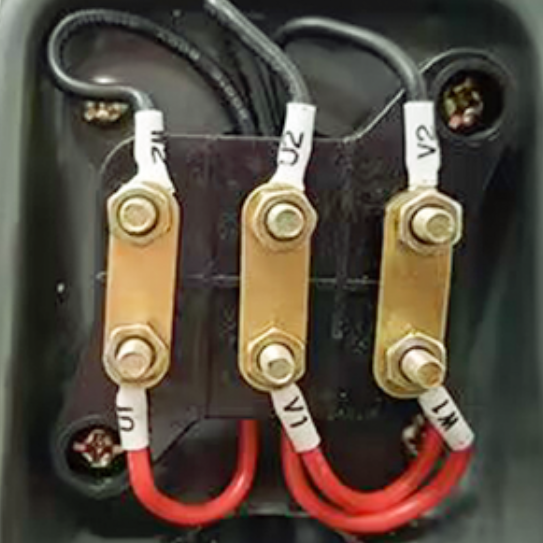 2.三相380V電機(jī)接法:橫向?qū)?個(gè)銅片接到3個(gè)獨(dú)立線柱即可。如圖所示
